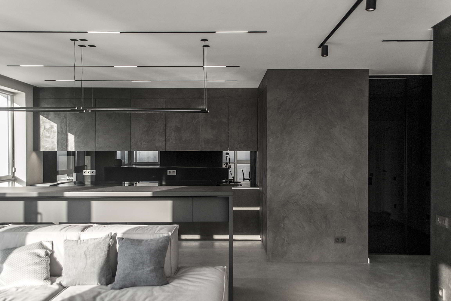 Ściany i podłoga z mikrocementu wykonane w Mińsku. Dom prywatny. Użyte materiały: DeHust, tekstura CemSolid. Powierzchnia 240 m². Kolor podstawowy. Czas realizacji: 24 dni.